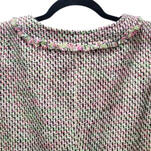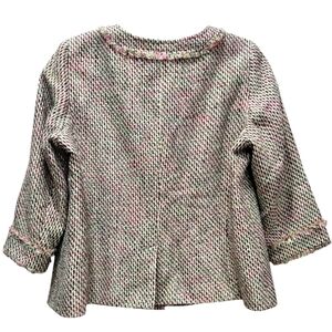 Designer inspired tweed button front blazer jacket that has fringe trim throughout the jacket. The colors mainly cream, pink and green. Sleeves are a 3/4 length. This is a great career staple piece to pair with a camisole or button down shirt underneath and a pencil skirt or trousers.