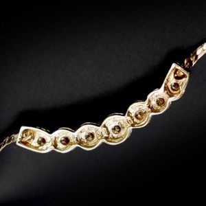 Gorgeous 14k curved bar necklace featuring 7 brilliant cut, intense natural Diamonds weighing .7 carats total. Classic and elegant. All stones are secure in their settings. No kinks or damage to chain. This was very loved and rarely worn; no significant signs of wear (see photos). No scratches or nicks in stones.