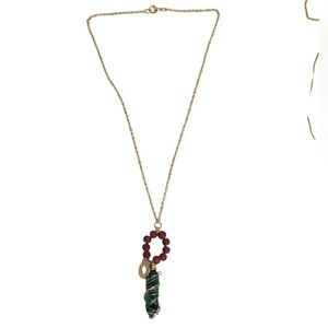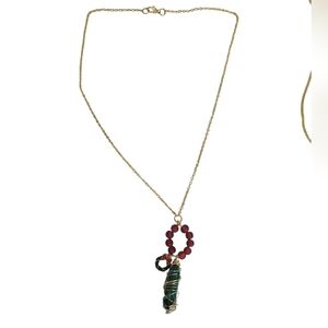 14k Red Bow Green Enamel Wreath Malachite Natural Gemstone Crystal Hexagonal Bullet Necklace
