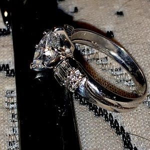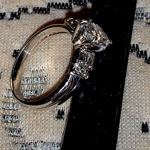 This is from my dgt. She said her spouse paid $12,000 for this ring. Over 2 1/2 carats! 14 k stamped band. Took it a jeweler in Whitefish, MT. It a long established store that is established at least 50 years. Wt is 4.7 g. Has large brilliant marquee center. Baggets on each side and also round diamonds on each size. More than 2 1/2 beautiful diamonds. Nice diamonds. White gold band. 14k