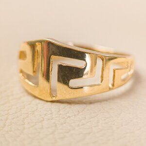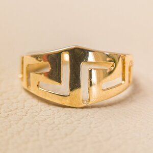 Keywords: 14k gold ring, Greek key jewelry, unisex gold band, vintage style ring, geometric gold design
