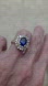 Reminiscent of Princess Diana this ring is large, with an over one carat natural sapphire in the center and over 1 carat in natural diamonds surrounding in this ballerina mount. Please let me know if you have any questions as I'm happy to answer.