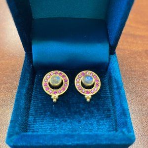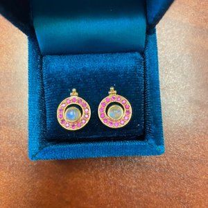 Gorgeous 14k gold earrings with pink rubies and moon stone centers. Very light weight and high quality.