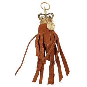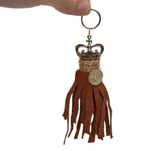 14k Gold Plated King Crown Cross Brown Suede Fringe Cork Coin Coin Keychain