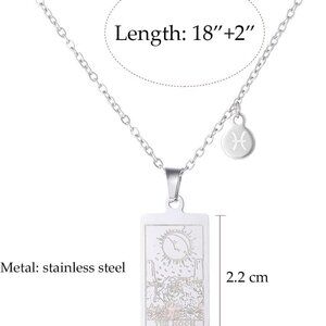 Product details Material Stainless Steel Metal type Stainless Steel Clasp type Lobster Chain type Rolo Gem type No Gemstone Item type name Pendant Necklaces About this item *BIRTH DATE: Feb.19 - Mar.20, double-sided PISCES constellation star and torat card - The Moon, your inner world is vast and spirtual. ENVIRONMENTALLY FRIENDLY: stainless steel, hypoallergenic, NO rust, change colour or tarnish problem, lead and nickel free, good accessory for everyday wearig ADJUSTABLE: chain length is 18 inches with 2.0 inches extension GIFT P