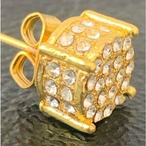 TAGS: iced out earrings, women’s CZ studs, gold crystal studs, hip hop jewelry, glam earrings, urban fashion, cube earrings, statement studs, street style sparkle