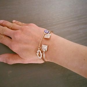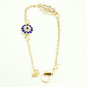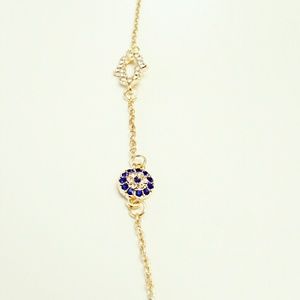 Beautiful pave cz in hamsa hand shape, attached to blue crystal evil eye charm on delicate 14k gold plated chain with 2 inch extender closure. Brand new! Brand new!