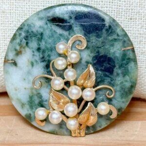14k MING'S Jade Disc W/Pearl Vine Brooch