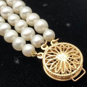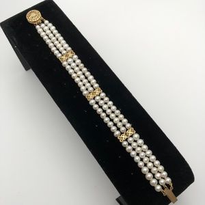 Solid 14k Yellow Gold Triple Strand Pearl & Diamond Bracelet
