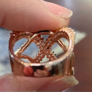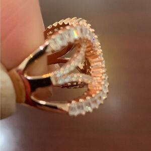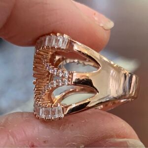 Beautiful Rose gold ring with unique design done in top quality cz stones . Gold over sterling . Size 7