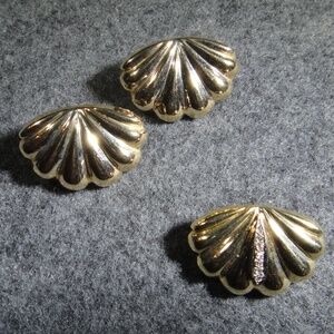 This is a vintage 14k yellow gold three piece set featuring a diamond enhanced scalloped slide and matching scalloped earrings. Each piece measures about 1 1/4" across and about 1" high. The slide can accommodate about any size chain. A very unique set, circa 1970's.