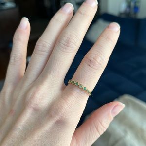 Beautiful Solid 14k Yellow Gold Bezel Ring with genuine 3 mm gemstones. Features unique milgrain detailing around each stone in a half eternity band setting. Handmade and hallmarked HJ India 14k. Bought this a while ago, can’t remember if the stones are green onyx or emerald, but whichever they are, Ive only ever bought genuine gems! The 9 stones are a bright blueish green color. The last two photos are for price reference of similar rings in 14k settings.