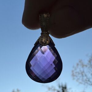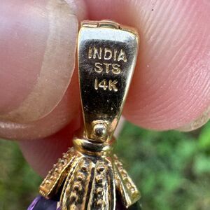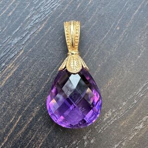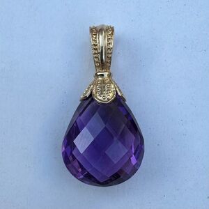 This is a beautiful deep purple Amethyst gemstone pendant with good clarity in a teardrop or pear shape, faceted in a briolette cut, with a solid 14k solid yellow gold, hinged bail. It does not come with a chain. This Amethyst has gorgeous color and the cut makes it sparkle nicely. The gold complements the natural stone well. Classy and elegant. Makes a great February birthstone gift.