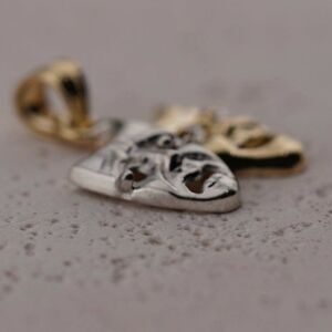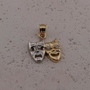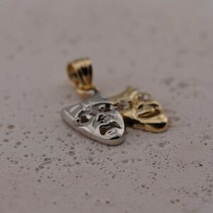 Weighing approximately 1.2 grams, this pendant showcases a harmonious blend of two tones in solid 14K gold, enhancing its visual allure and sophistication. The intricate design reflects the essence of drama and storytelling, making it a distinctive and meaningful accessory.