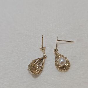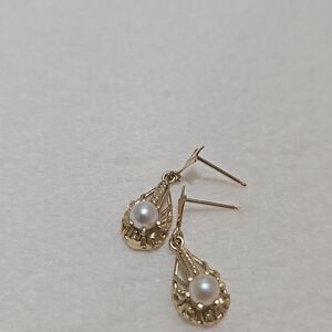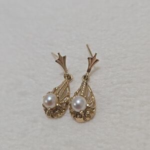 These Vintage 14k Solid gold drop earrings feature a stunning natural pearl centerpiece.