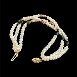 14k Three Strand Freshwater Pearl Multi gemstone Beaded Bracelet 7.5 Inches