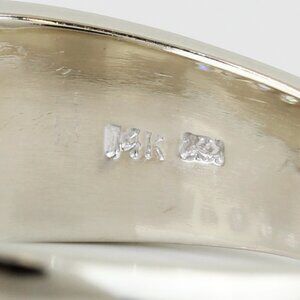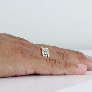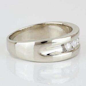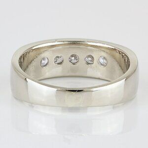 This lavishly crafted ring is made out of 14 Karat White Gold and features a band of 5 Diamonds totaling .50 Carat. "14K" is stamped onto the inside of the ring. This ring is resizable by any qualified jeweler.