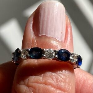 elegant women's 14k solid white gold eternity band with 8 oval sapphires and 8 round diamonds