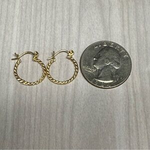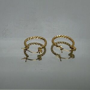 These gold earrings feature a distinctive horseshoe shape with a twisted, rope-like texture that adds a touch of elegance to their minimalist design. Crafted with a warm yellow-gold tone, they are perfect for adding a subtle yet sophisticated accent to any ensemble.
