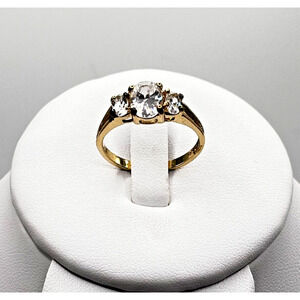 This stunning 14k yellow gold band is the perfect symbol of eternal love. The band features three round simulated cubic zirconia stones that sparkle with every movement. The channel-set design ensures that the stones are securely held in place, while the sizable band allows for a perfect fit. The band is signed by the brand Eternity and is a vintage piece that has stood the test of time. The yellow gold metal is pure and the band is designed for women. With a ring size of 7.5 and a weight of 2.64G, this band is a true statement piece. Whether you're looking for a wedding or anniversary band, or simply a special gift for a loved one, this 3 stone band is sure to impress.