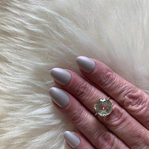 Gorgeous Green Amethyst Ring in an approximate Size 7. It is stamped 14K, but it's so tiny that I can't get a picture. This ring is pre-owned, in fabulous condition.