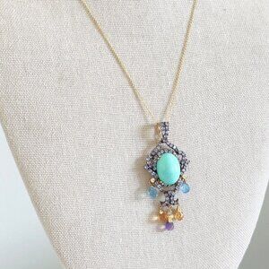 14k Yellow Gold Turquoise Multi Gemstone Chandelier Pendant Chain Necklace 18"