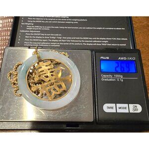 14k Yellow Gold Vintage Jade Chinese Character Pendant Necklace 26" Rope HS102
