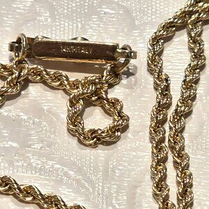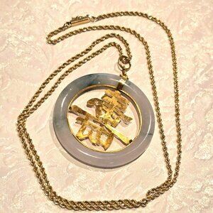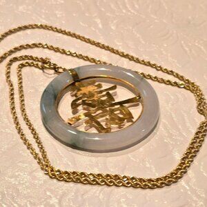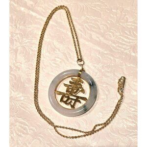 This elegant vintage necklace features a 14k yellow gold Chinese character pendant (I think this is longevity) within a green/white jade circle, offering a sophisticated blend of tradition and style. The pendant's unique design is complemented by a matching 14k gold rope gold chain. Ideal for those seeking a meaningful and stylish jewelry accessory.