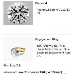 Ring is 14K gold with real diamond and blue stones. Ring has diamond certification. Ring is engraved.