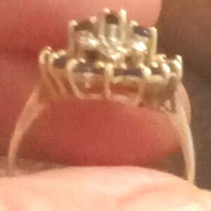This 14k yellow gold cocktail ring features a stunning round -shaped blue sapphire as its main stone, and the edges are done in sapphire in the shape of marquis. Accented with sparkling diamonds with Two marquis cut diamonds and the rest are round diamonds. The prong setting adds an elegant touch to this fine jewelry piece, which is perfect for any occasion. The ring is a size 7 and is crafted with 14k gold. It belongs to the fine jewelry category of rings and is a beautiful addition to any jewelry collection.