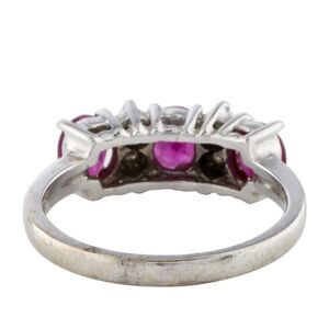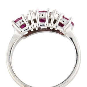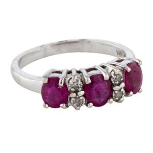 14K white gold cocktail ring featuring 0.94 carats of oval faceted rubies and 0.05 carats of single cut diamonds.