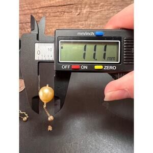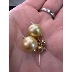 Genuine natural golden yellow South Seas Pearls measuring about 11mm in diameter, dangling from 14k authentic yellow gold chains and posts. Earring backs are also 14k gold as well. Purity stamps on backs and posts. Acid tested and tested on a KEE gold tester for purity verification. Total weight of pearls and gold is 4.71 grams. Earring length is roughly 1.5 inches. Earring balls are hollow. Pearls are cultured, of course, and not treated.