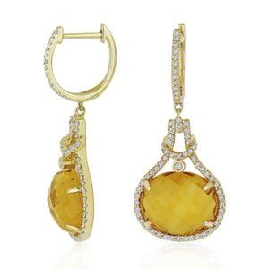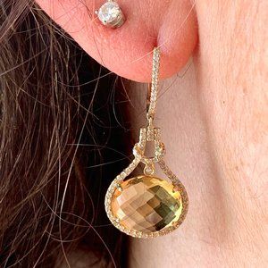 8.65carat total weight of checkerboard cut Citrines set in 14k yellow gold surrounded by a halo of diamonds .45ctw. Hinged for movement - dangling from small huggie style hoop with diamonds. Snap closure.