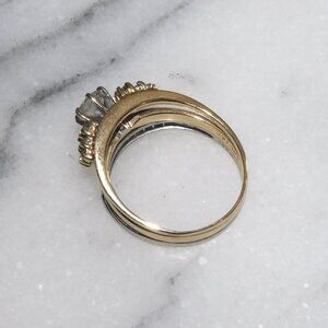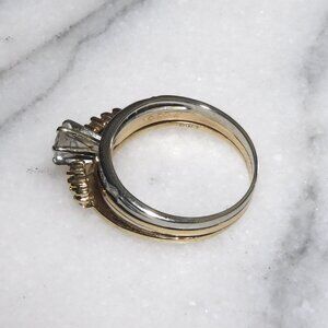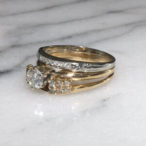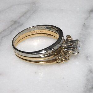 Up for sale is a beautiful 14k/18k solid yellow and white gold .50ct natural diamond solitaire wedding ring set. This lovely set is in very good condition and they are soldered together. It features a 5mm round cut natural diamond (.50ct) surrounded by 19 round cut natural diamond accents. We do not know the exact color or clarity of the diamonds but they do have a nice color and a pretty sparkle. The yellow gold rings are hallmarked 14k and the white gold ring is hallmarked 18k but please be aware that they could test at a slightly lower purity by eBay Authentication since they are older rings and we don't have the special equipment to know the exact purity. You will receive ONLY what you see in the pictures above. Actual photos shown above.