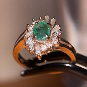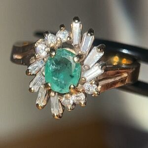 Real 14k Yellow Gold Emerald Ring Surrounded with Baguette and Round Diamonds, NOT GOLD PLATED OR GOLD FILLED.