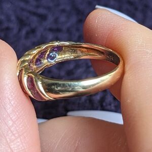 this ring is in vintage condition and has a crack in the gold, see last photo, all stones are secured with glue but this piece may not be sizeable and/or may need additional work, wears great and nothing is at risk if left as is, but sizing may disrupt things