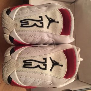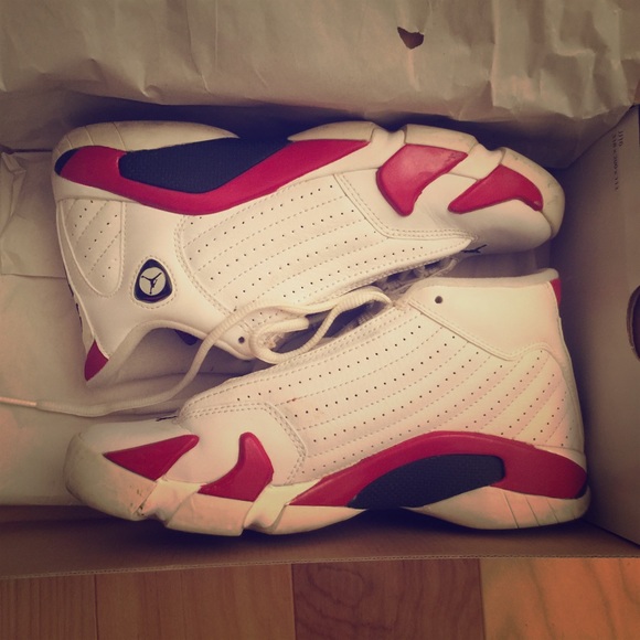 Classic Jordan 14s in white and red, big kids size 5.5. Perfect for sneakerheads, collectors, or kids who love iconic Jordans.