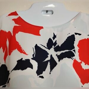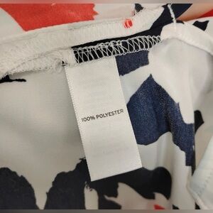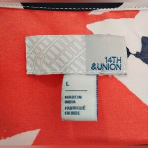 Make a bold statement with this oversized blouse from 14th & Union. Features a striking abstract floral print in red, black, and white on a smooth, flowy fabric. Designed with a relaxed fit and short sleeves, this top is perfect for pairing with jeans or slacks for a chic, modern look. Size L. Made in India. Minor flaw shown in picture.