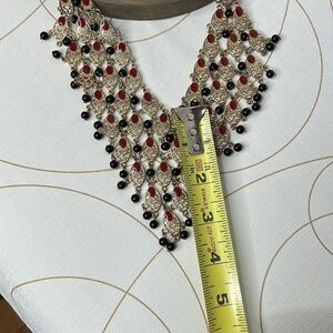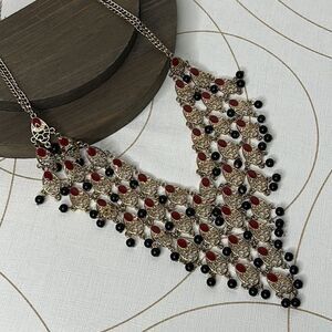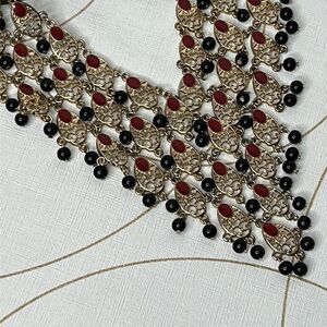 Description: 14th & Union statement collar necklace, red, black, gold tone, bib necklace