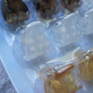 Black, tortoiseshell brown, frosted clear, and frosted golden tan color. They look to be pretty small at about 1/2 inch across.
