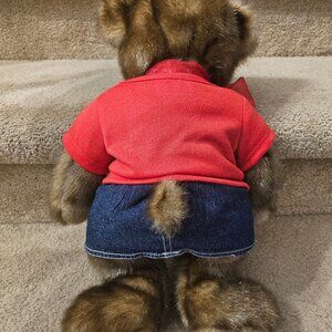 An adorable 15 inch Gund Bear in Build A Bear Clothes Christmas Bear Plush. She has the prettiest light brown fur. It has a shimmery sparkle to it. The bear has on red knit T shirt with holiday graphics on a Christmas tree with gifts beneath it. Snowflakes and the words Merry Christmas below the tree. The outfit includes a denim skirt with rhinestones. There is also a pretty sheer red bow at the bear's neck. The bear's face has brown eyes and brown embroidered nose. She measures 15 inches tall and approximately 11 inches wide. In great pre-owned condition with no flaws. Non smoking pet free home.