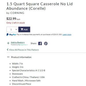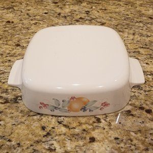 This is a Abundance Corelle 1.5 quart square casserole dish with no lid and has a fruit design made by Corning, measuring 7" wide and 3" tall. They are a versatile pattern that can be used for any occasion both casual or formal. These durable Corning items are a superb way to add beauty for entertaining! They feature colorful fruits on both sides. I also have a luncheon plate, dinner plate, oval serving platter, and one other 1.5 qt. bakeware dishes with no lid shown in last picture. If you want to add them, I can make a special listing for you. These dishes are made very durable!!