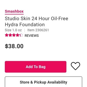 Smashbox Studio Skin 24 Hour Oil-Free Hydra Foundation is a high-performing liquid foundation powered by Hyaluronic Acid that's proven to stay put for 24 hours. The oil-free formula easily builds from medium to full coverage, giving you a fresh, natural matte finish that never settles into pores or lines. Find your perfect match among 40 shades (that won't oxidize) & a broad range of undertones.