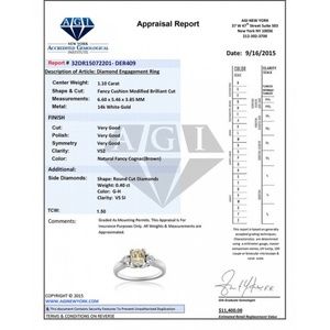 This stunning diamond engagement ring in 14K White Gold is perfectly set with a sparkling 1.10 carat Fancy Cognac Cushion cut center diamond, with a clarity of VS2 in a prong setting. This diamond engagement ring has Round brilliant cut diamond side stones in a prong setting with a total weight of 0.40 carat and a color clarity of G-H/VS-SI. Engagement ring weighs 4.1 grams, widths 6.8mm and size 6.75. Free resizing.
