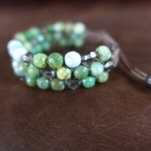 orgeous Chan Luu bracelet with multiple beads/stones in varying green shades and a few that are white with green
