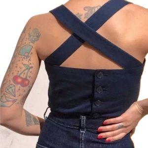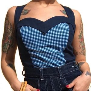 $150 Italian Bustier Small Blue Cup A / B Handcrafted Halter Top Gingham 1950s