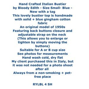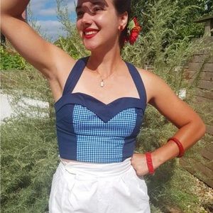 $150 Italian Bustier Small Blue Cup A / B Handcrafted Halter Top Gingham 1950s