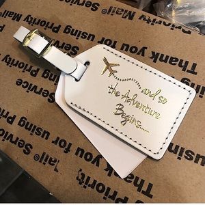 NEW! Handcrafted, white leather luggage tags, with gold engraved foil imprint that reads: