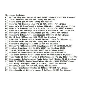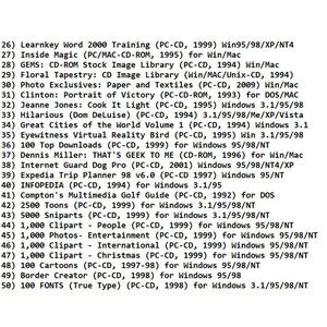 System Requirements: Varies for each title. Some are DOS, some are Windows 3.1 and some are Windows 95 or 98.