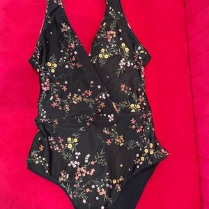 NWOT*This Maje Catchy Serene one piece swimsuit is fully reversible for two different looks. Features a vibrant floral design on a black background. Perfect for a fun day at the beach or pool. Size small. Hygienic liner intact.